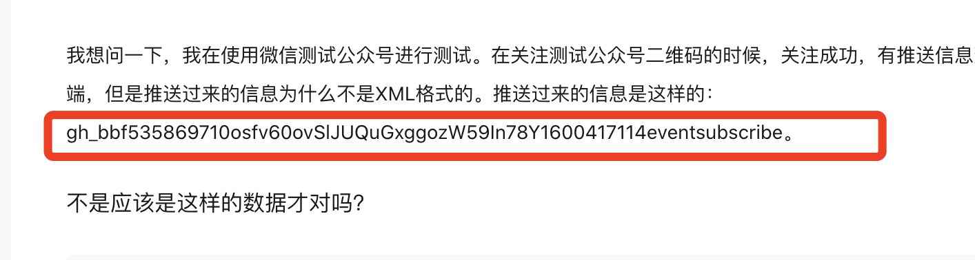 我想问一下,我在使用微信测试公众号进行测试。在关注测试公众号二维码的时候,关注成功,有推送信息到我的服务端,但是推送过来的信息为什么不是XML格式的。推送过来的信息是这样的:gh_bbf535869710osfv60ovSlJUQuGxggozW59In78Y1600417114eventsubscribe。