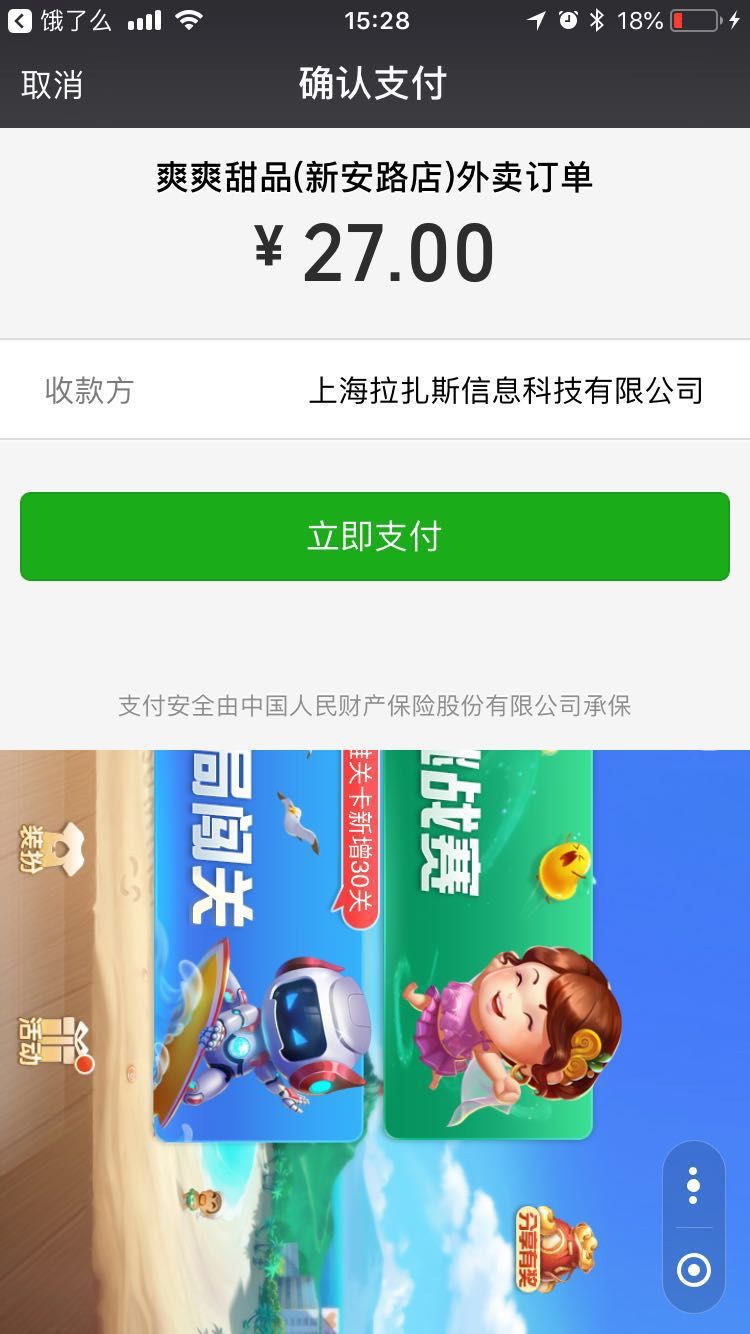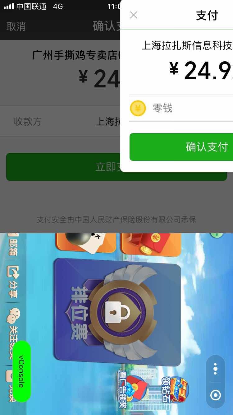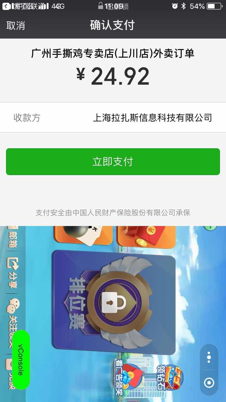 微信端还在小游戏里,切后台去点外卖,选择微信支付,弹窗如下图: