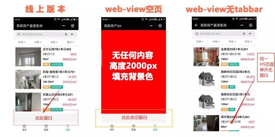 同一页面,在有原生tabbar的情况下,web-view和tabbar中间就会出现留白,但是单开的话web-view填充满屏显示,特此还做了个高2000px的纯色页面(无任何内容)替换线上版本中出现留白的H5页面,留白情况依旧存在