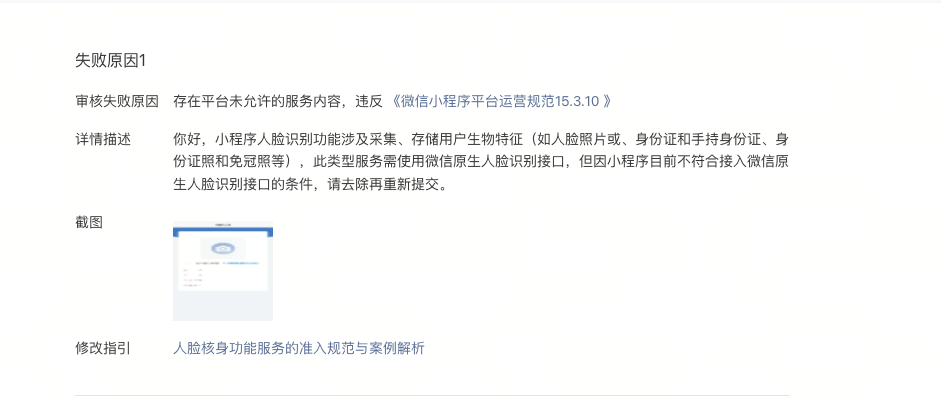 你好,经核实,你的小程序人脸识别功能涉及采集、存储用户生物特征(如人脸照片或、身份证和手持身份证、身份证照和免冠照等),此类型服务需使用微信原生人脸识别接口,但因小程序目前不符合接入微信原生人脸识别接口的条件,请去除再重新提交。