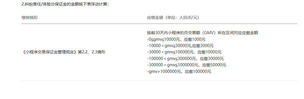 保证金金额按月动态调整,根据您小程序前30天GMV(月交易额)所在档位确定应缴额(如:30000<gmv≦100000元,应缴10000元)。