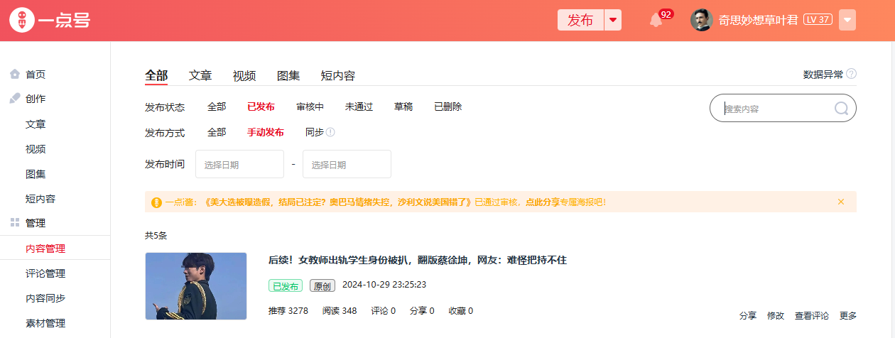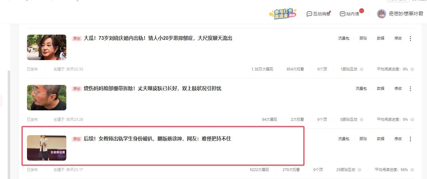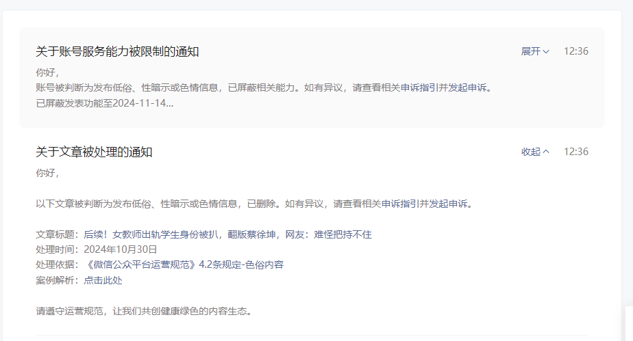 但是后续的几次判定违规变得越来越离谱,今天这次违规(文章:后续!女教师出轨学生身份被扒,翻版蔡徐坤,网友:难怪把持不住)更是让我百思不得其解,请问这样一篇普普通通的社会热点事件报道何来的“低俗、性暗示或者色情信息”?这篇文章没有任何的不良引导,不管是文字还是图片都是在警醒读者、抵制事件本身的三观崩塌。请问平台是否存在对恶意举报行为的纵容或者审核疏漏,难道只要有人恶意通过某些手段进行批量举报,数量过多系统就会判定违规?我昨晚23点59分发布的文章,今天一大早就被举报违规并且通过,这不是盯着我的账号举报吗?如果平台纵容的话,那是不是同行只要眼红对方就可以通过这样的方式将对方封号?