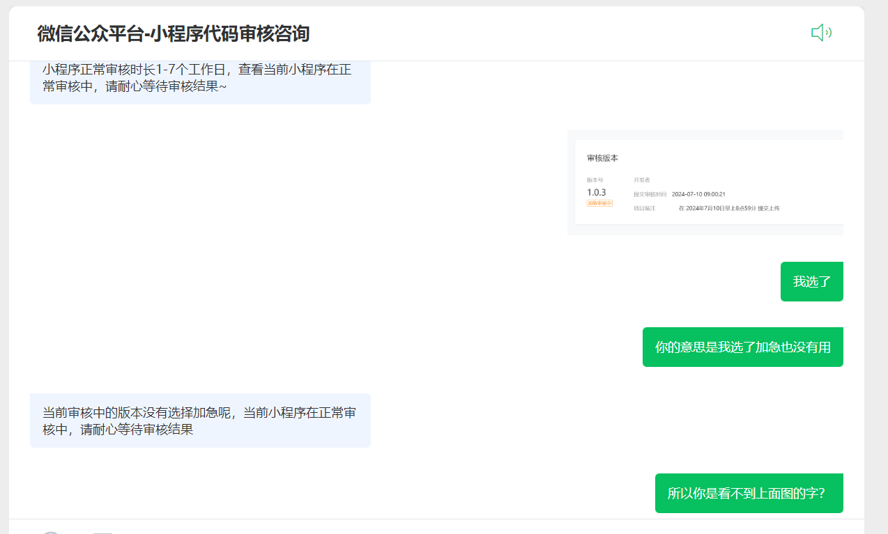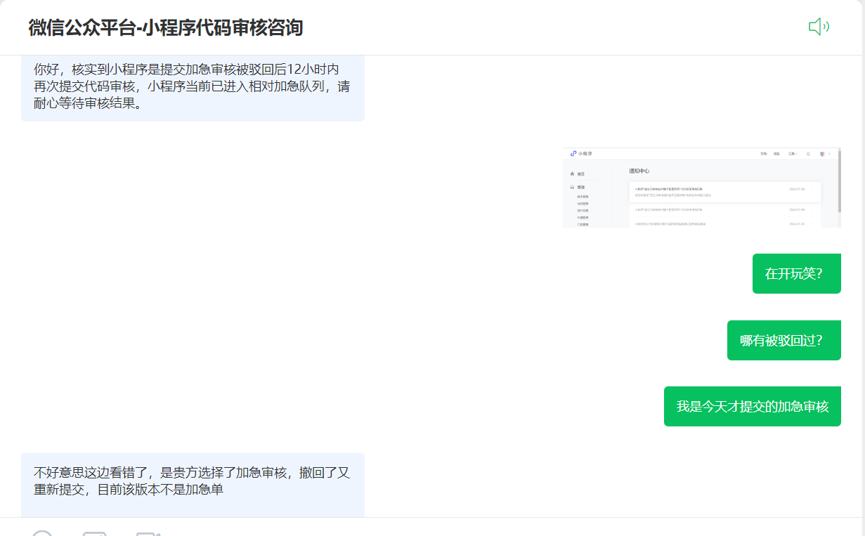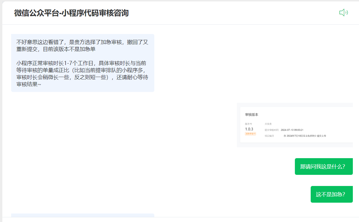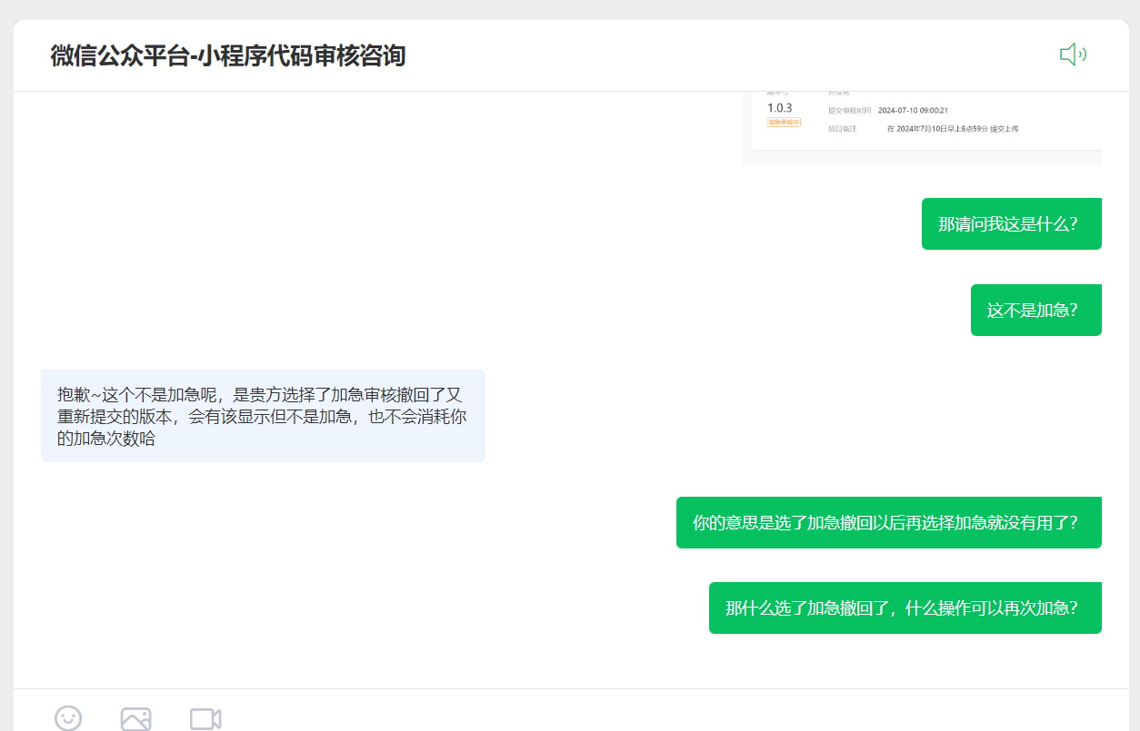 小程序提交了加急审核,因发现问题,随即撤销了加急审核,修改过后重新提交了加急审核,两小时内没有审核,问了客服,回答如下:
