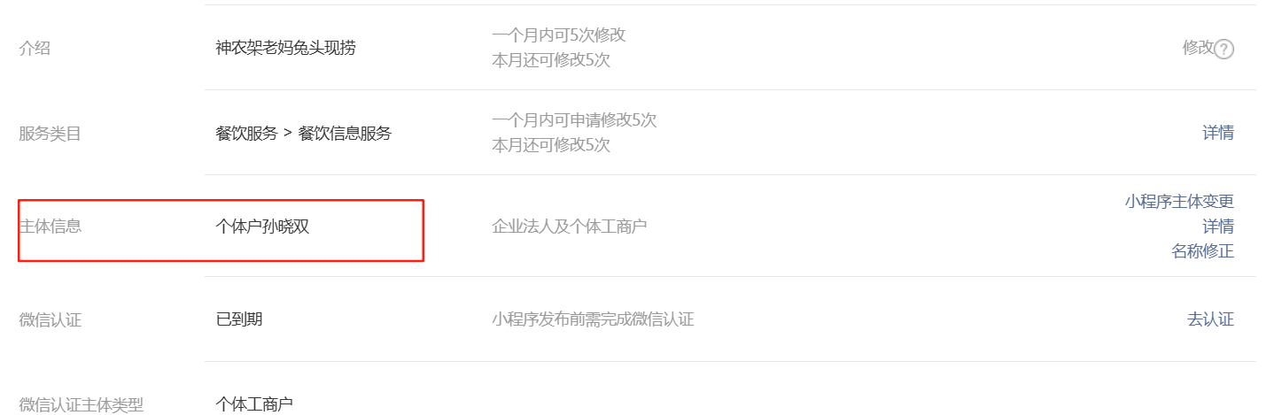 我这个小程序原来是神农架林区松柏镇老妈兔头,但现在小程序变成了个体户孙晓欢,现在想主体变更该如何操作?