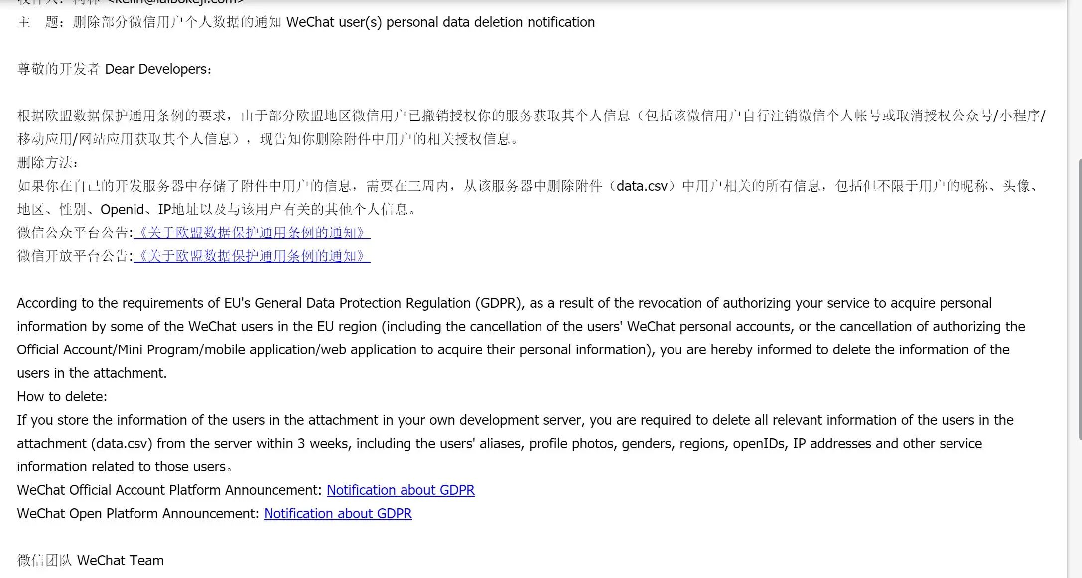 我们这边在年前收到一封关于删除欧盟用户数据的邮件,由于没及时查看邮件和及时处理,导致现在账号被封禁。现已根据邮件相关内容进行删除处理,请问是否可以帮忙核实解封下?公众号APPID:wxd37836646d245b88