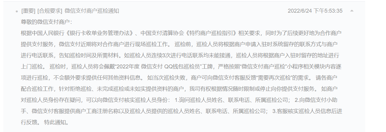 我的商户是1582996231,接到巡检通知忘记做了,导致现在账号被关闭支付权限了,请求微信支付再次巡检