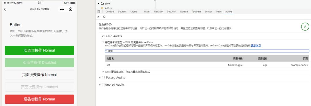 我的一个小程序,只在页面显示一行文字,没有数据 。在Audits中也报告: 存在将未绑定在 WXML 的变量传入 setData, 变量为__webviewId__
