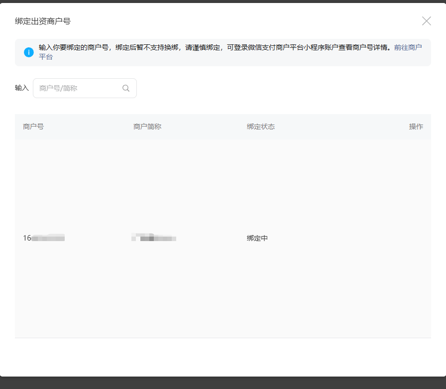 2.若还未绑定成功,请先正常去绑定,注意:先核实MP后台跟商户号平台的主体是否一致