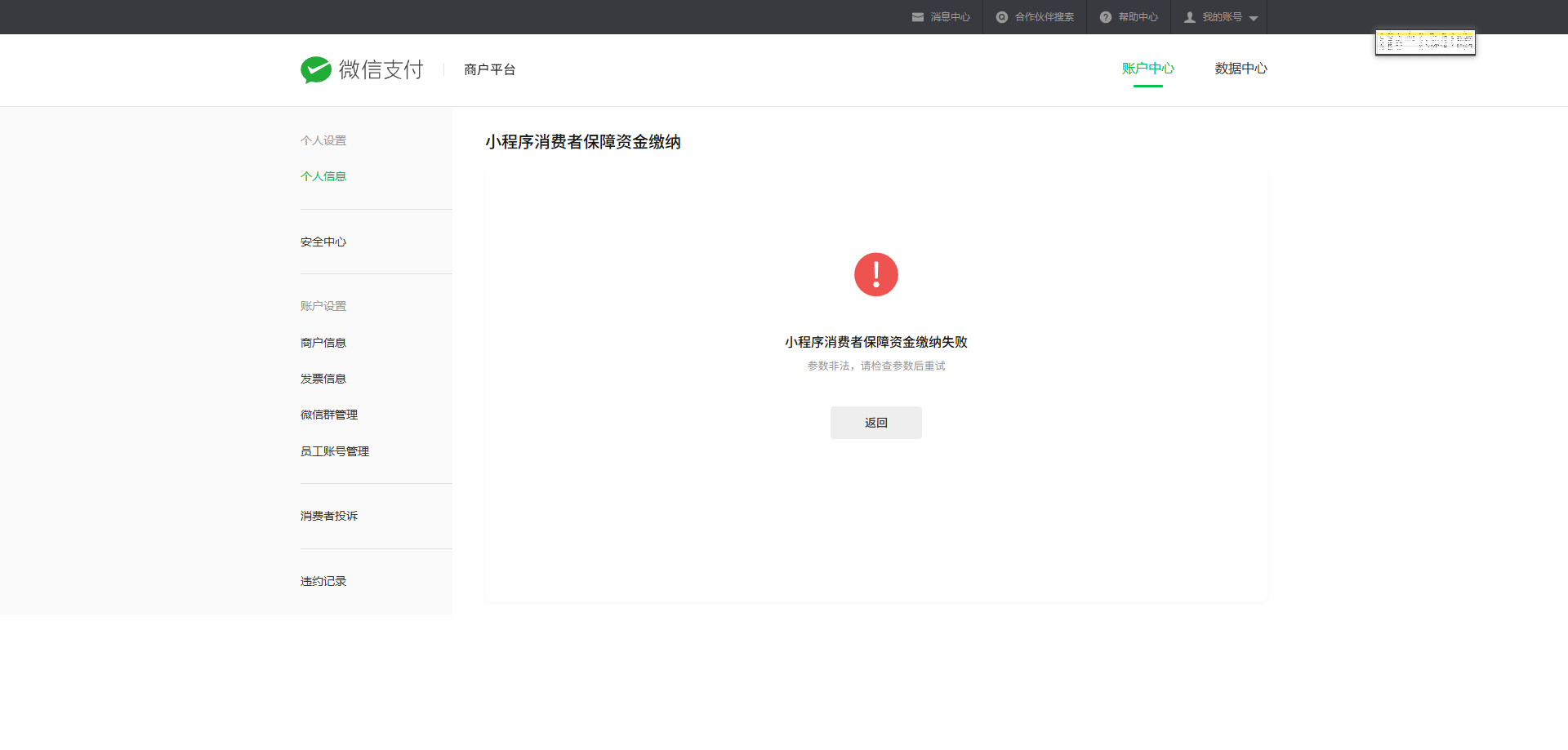 1.是否已在mp后台-支付与交易-交易保障-消费者保障资金绑定了出资商户号