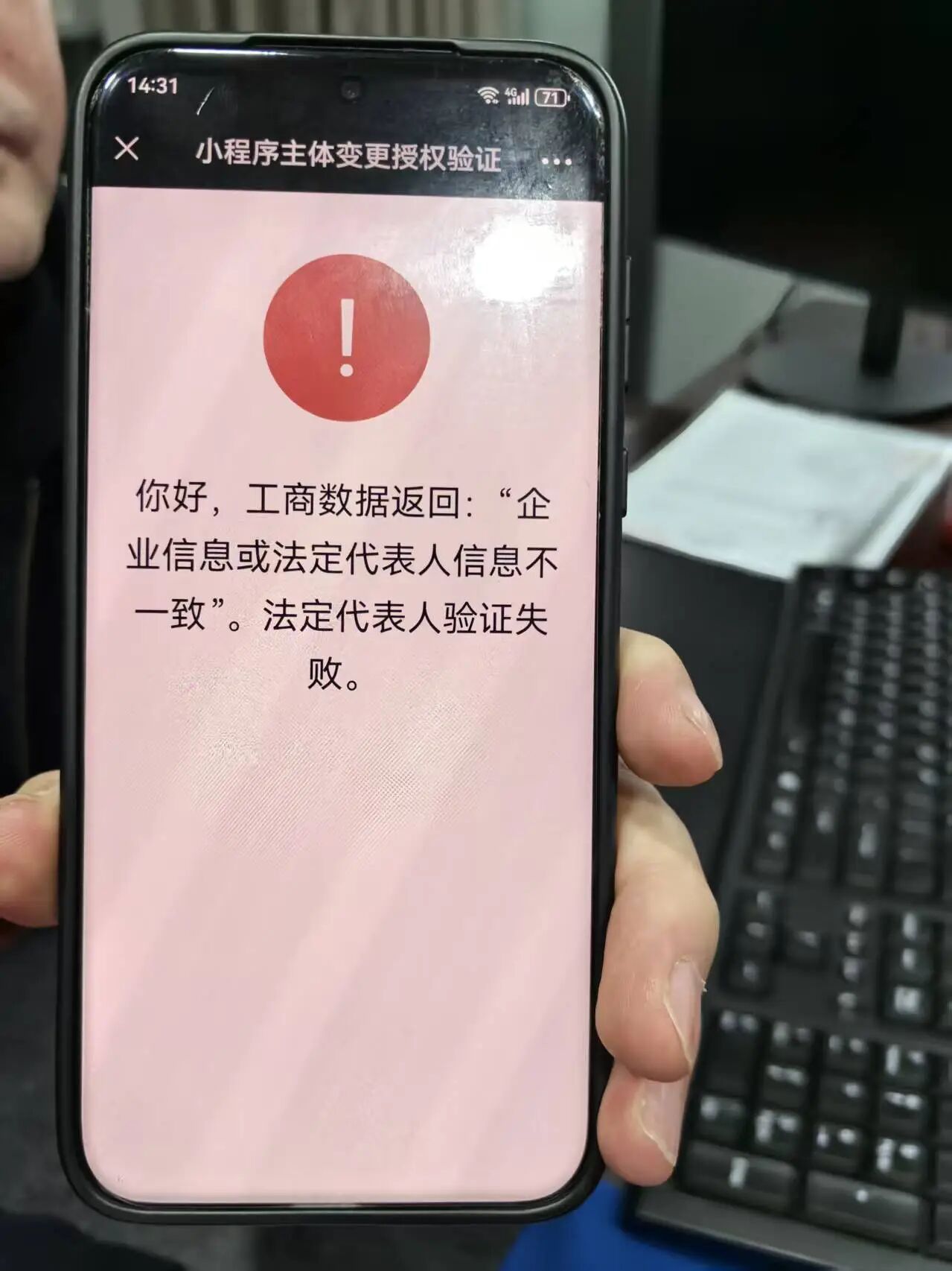信息填写完成之后,在第三步授权验证环节,目标法人扫码验证后出现“法定代表人信息不一致”,反复确认扫码微信是法人的实名认证