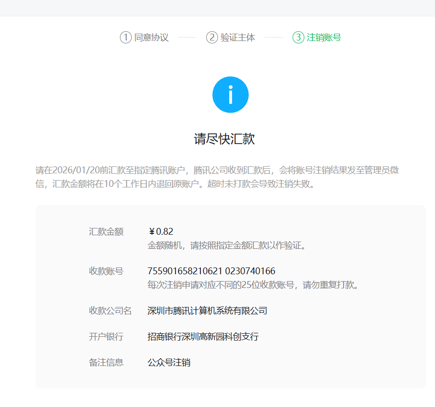 你好,主体名称存在变更需先通过【公众号设置】进行主体名称修正,提交新主体证件材料(包含更名后的营业执照等)并加盖公章,待修正审核通过后再进行注销流程。若当前对公账户名称与主体信息不符会导致验证失败,请先完成主体信息变更后再重新提交注销申请。