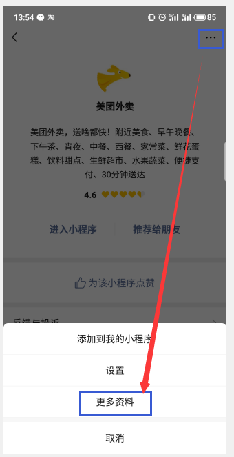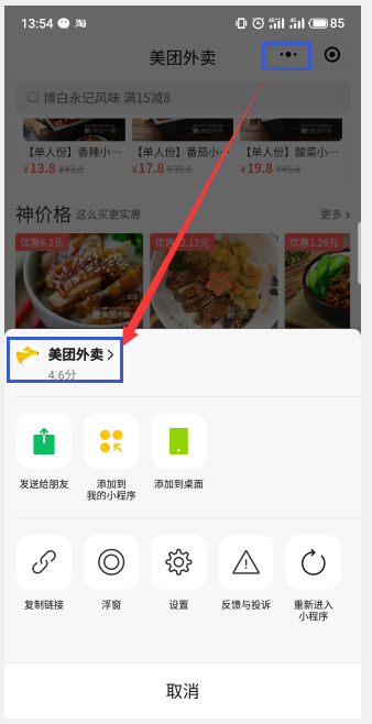 开启成功后台,重新打开美团外卖小程序,点开自己的店铺首页,右上角3点,会看得有个复制链接