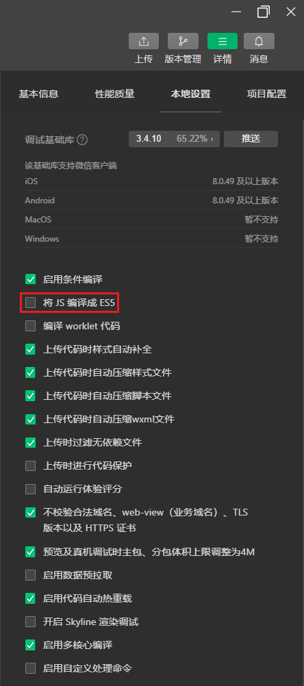 我是勾选这个编译成ES5,真机调试一次,出现这种情况。然后再取消这个勾选,重新真机调试就好了。