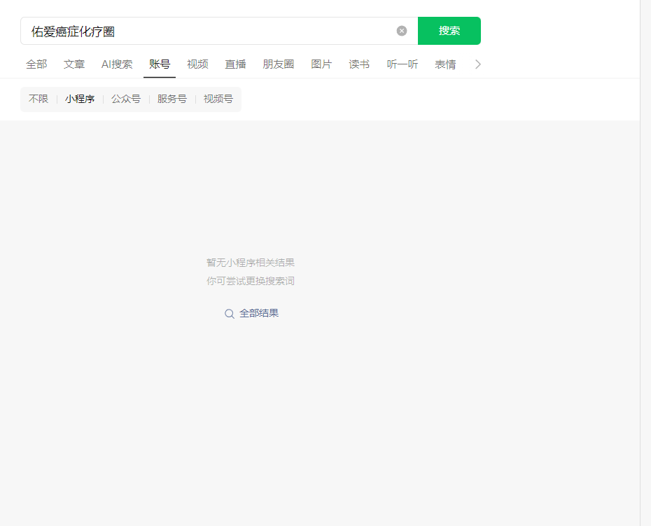 我的小程序在小程序搜索名称搜索不出来。名称是佑爱癌症化疗圈。我的appid是:wx3ee4d01e63e37e0d。请官方麻烦看下哦。搜索全称也没有。后台设置是正常的,二维码扫码也能正常打开。小程序认证备案上架已经好几天了。官方帮忙看看