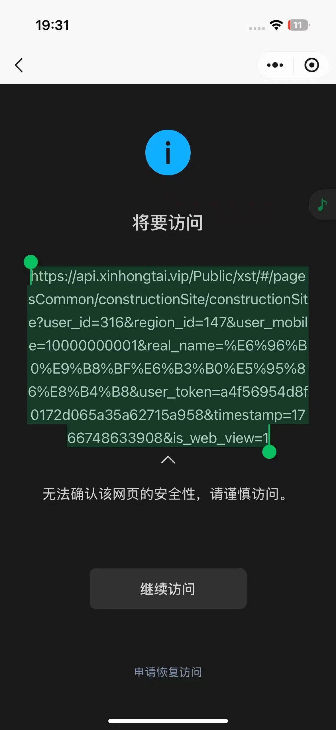 | https://api.xinhongtai.vip/Public/xst/#/pagesCommon/constructionSite/constructionSite?user_id=316®ion_id=147&user_mobile=10000000001&real_name=%E6%96%B0%E9%B8%BF%E6%B3%B0%E5%95%86%E8%B4%B8&user_token=a4f56954d8f0172d065a35a62715a958×tamp=1766748633908&is_web_view=1 |