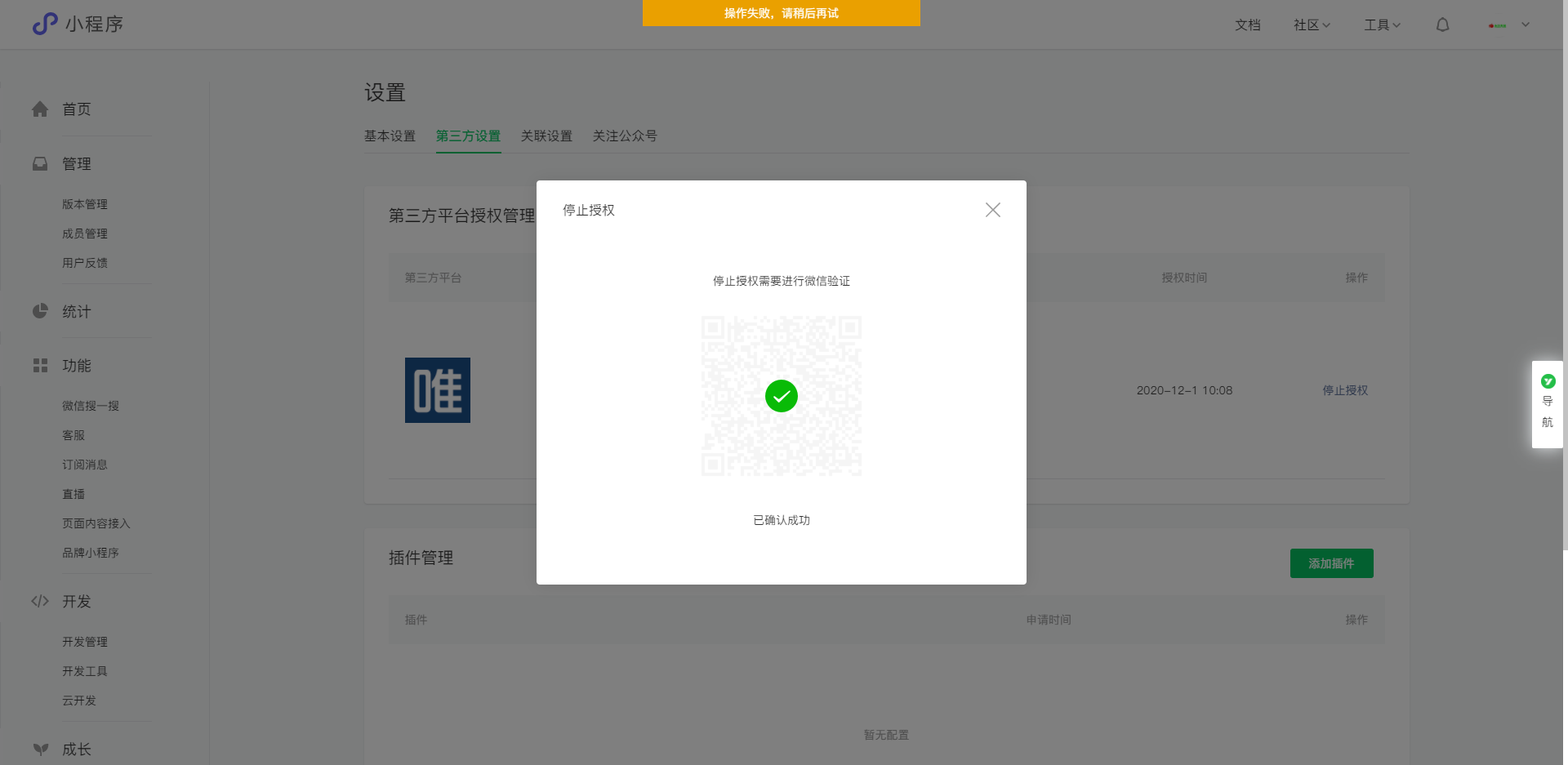 小程序已授权第三方,现在取消授权老是是败,求答?