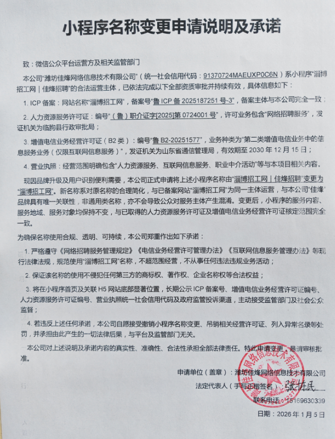 - 拟变更的“淄博招工网”系原名称“淄博招工网|佳烽招聘”的简化版本,并非通用名称: