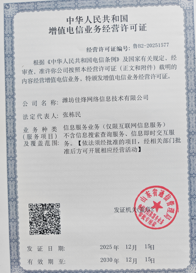 - 增值电信业务经营许可证(编号:鲁B2-20251577),业务种类为第二类增值电信业务中的信息服务业务(仅限互联网信息服务)。