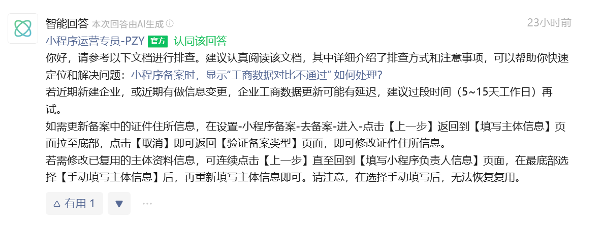 但是通过AI回答提示仔细比对:1,当前企业不是新建企业,并且核实营业执照上的【住所】信息与国家企业信用信息公示系统的【经营场所】信息相一致。需要解决!!!AppID:wx67f4c09ead8c6ca6