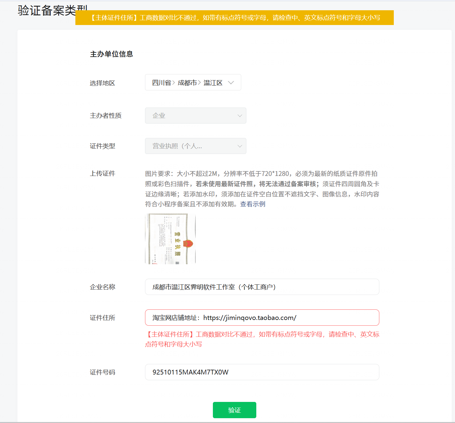 小程序备案时不通过,原因:【主体证件住所】工商数据对比不通过,如带有标点符号或字母,请检查中、英文标点符号和字母大小写