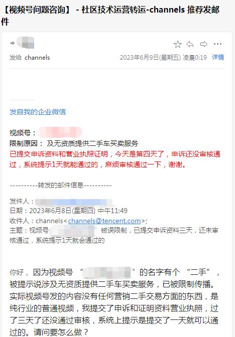 因为视频号(视频号ID:sphdtvJflTp18GR)的名字有个 “二手”,被提示说涉及无资质提供二手车买卖服务,已被限制传播。实际视频号发的内容没有任何营销二手交易方面的东西,是纯行业的普通视频,我提交了申诉和证明资料营业执照,过了三天了还么通过审核,系统上提示是提交了一天就可以通过的。请问要怎么做?