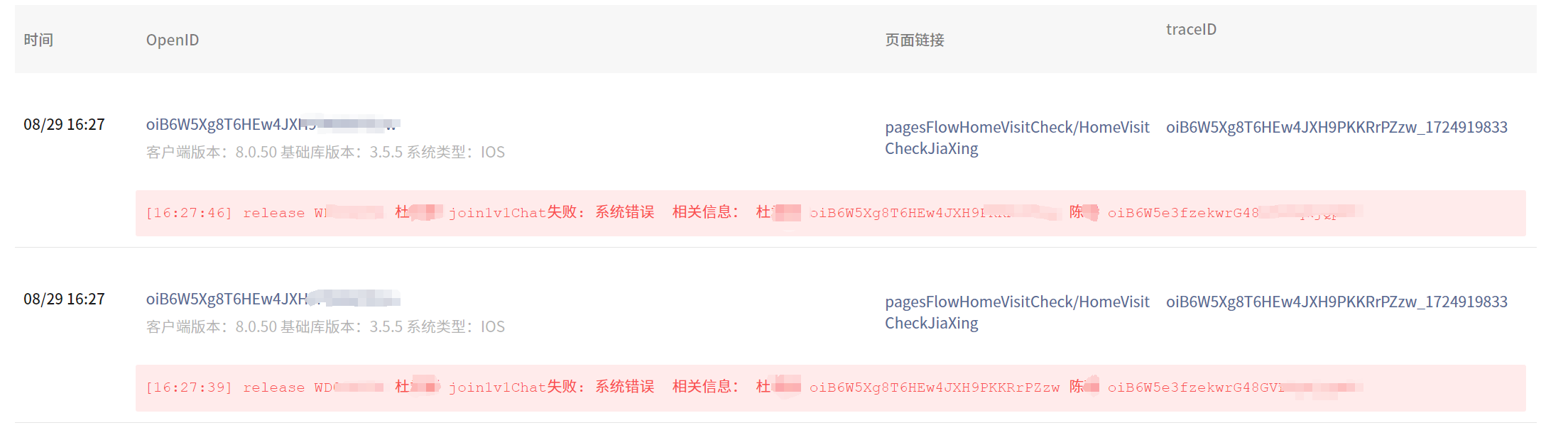 出现问题时间点以及日志记录见下图:08/29 16:27 用户已提交微信日志