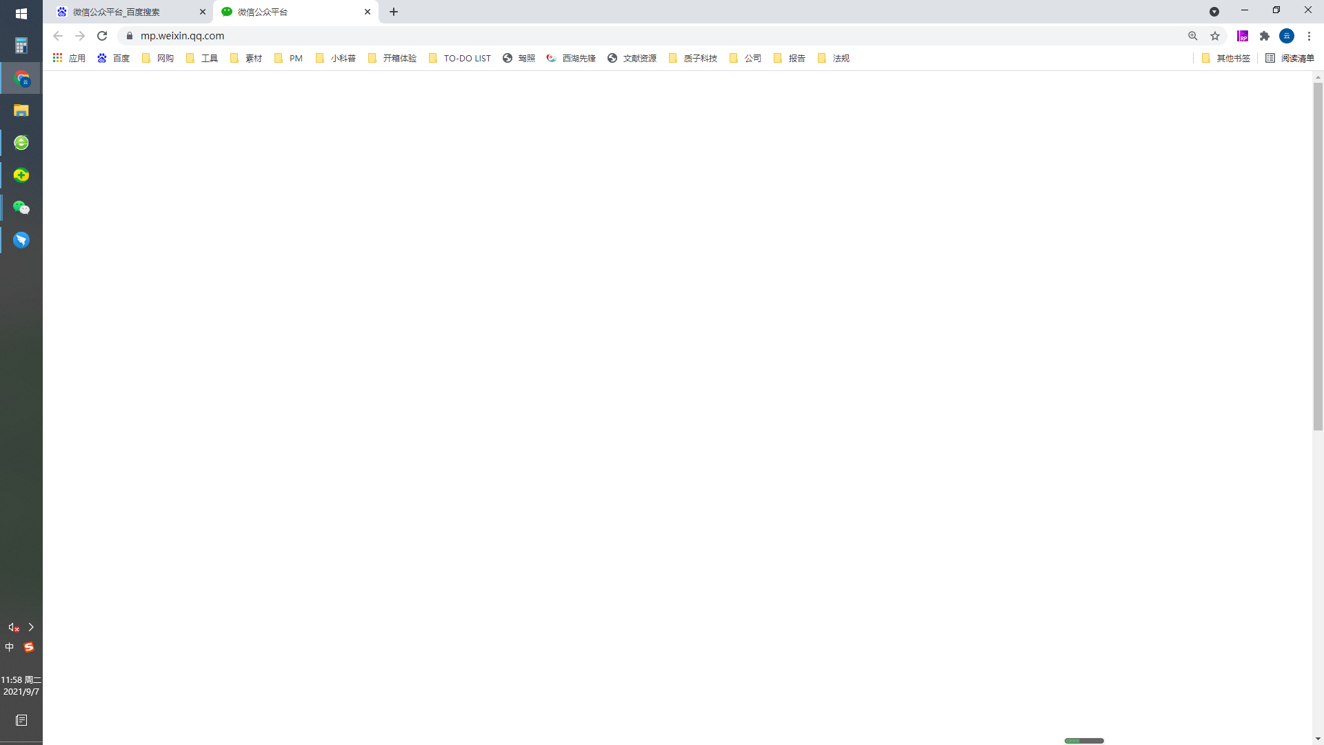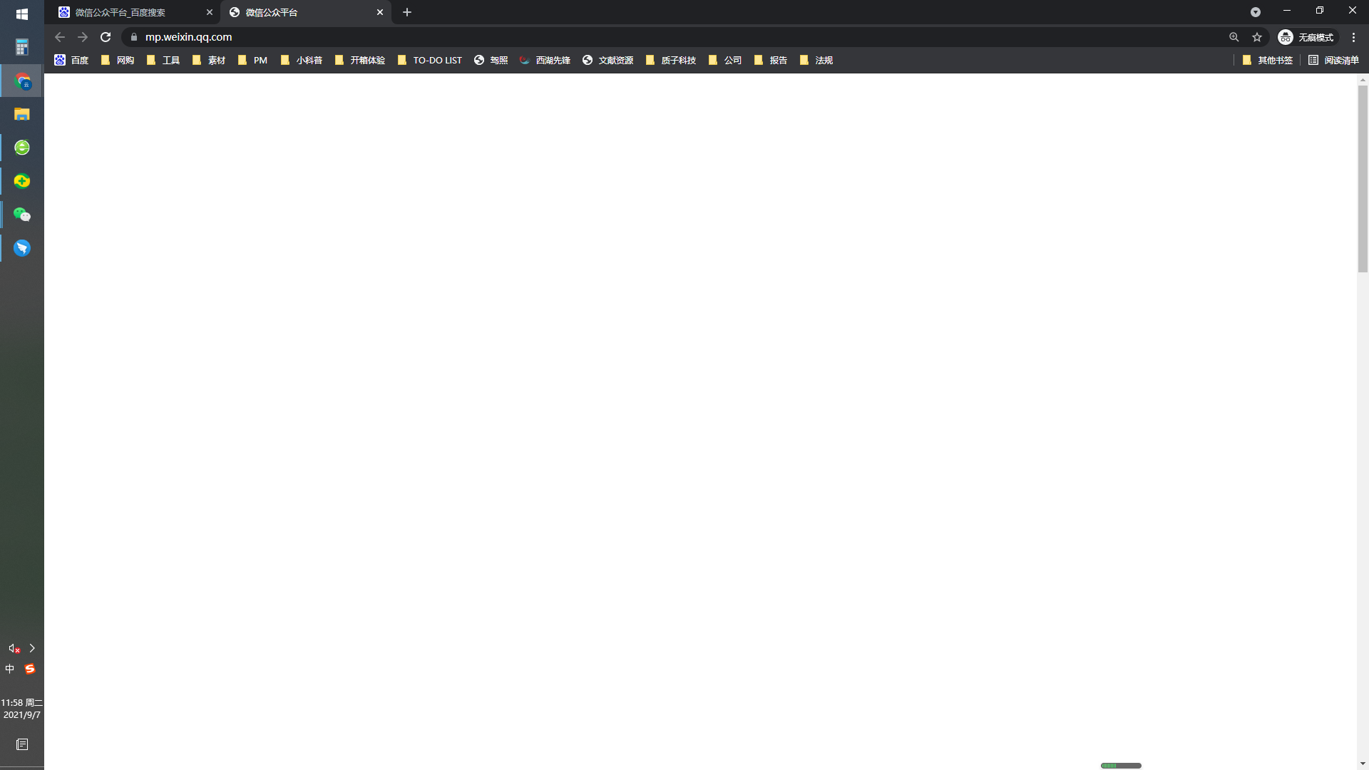 1、11:57使用谷歌浏览器搜索微信公众平台,11:58点击进入,页面无内容。无登录选项,页面完全空白。
