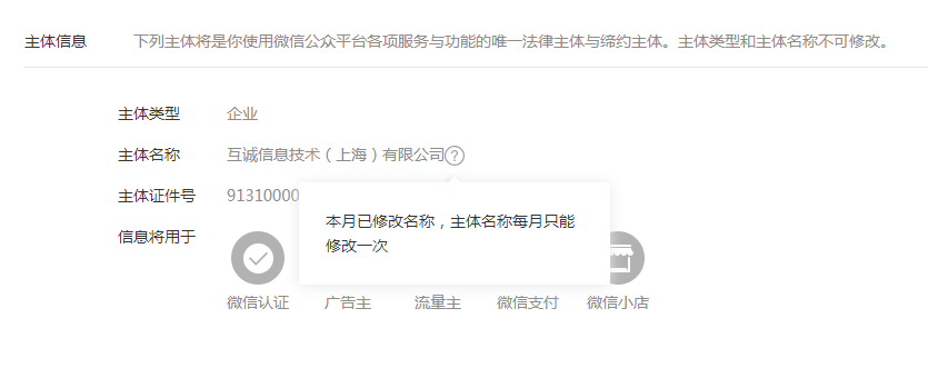 主体名称尚未同步,麻烦可以将公众号的主体名称修改为和小程序的同步吗,即将公众号的全角符号修改为半角,谢谢!我们无法自行修改