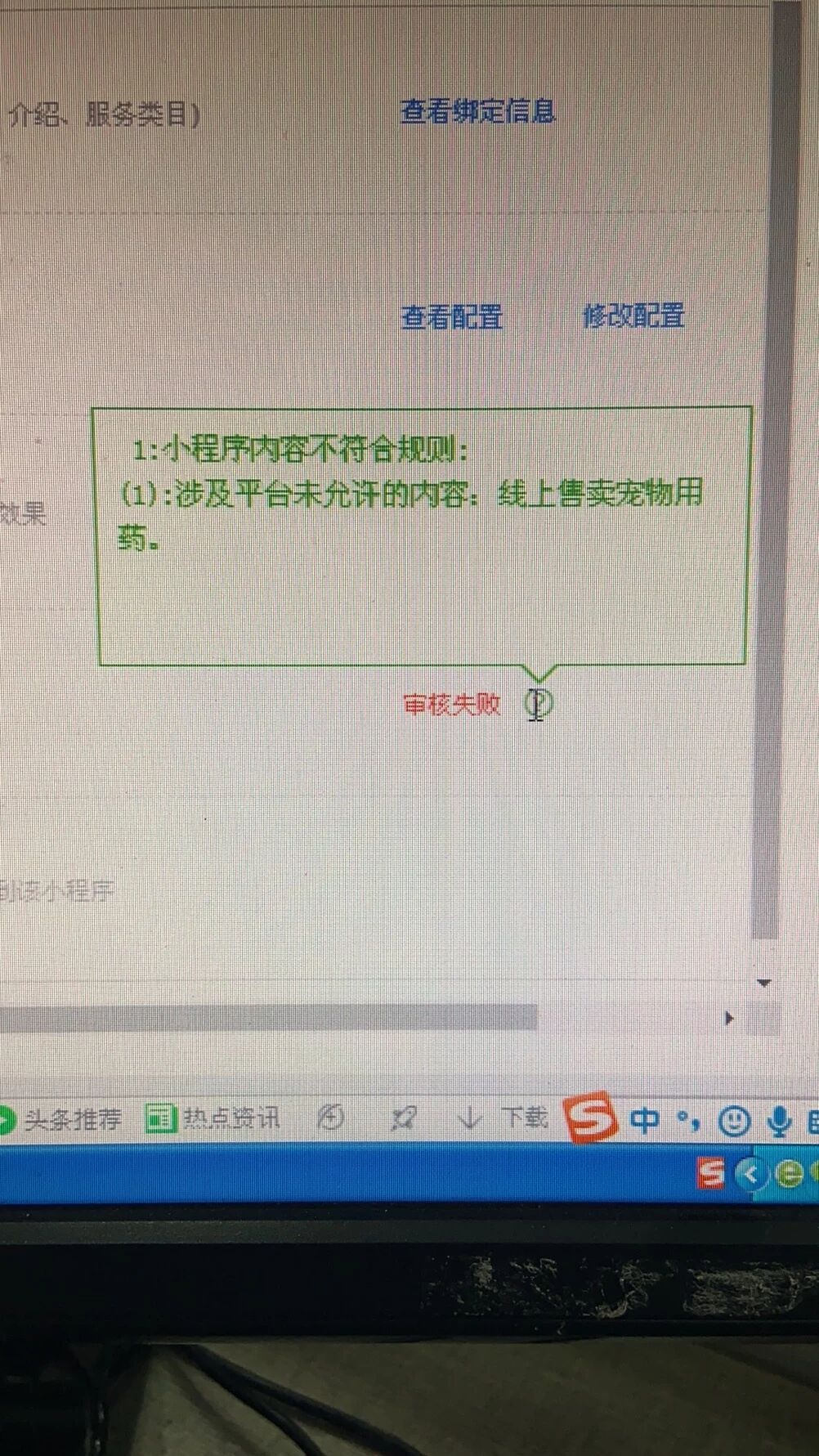 你好,经核实,未查询到贵方小程序的提审记录,请确保帐号提供正确,或请提供更多具体信息,若小程序涉及提供线上售卖畜牧类用药,涉及平台未允许内容