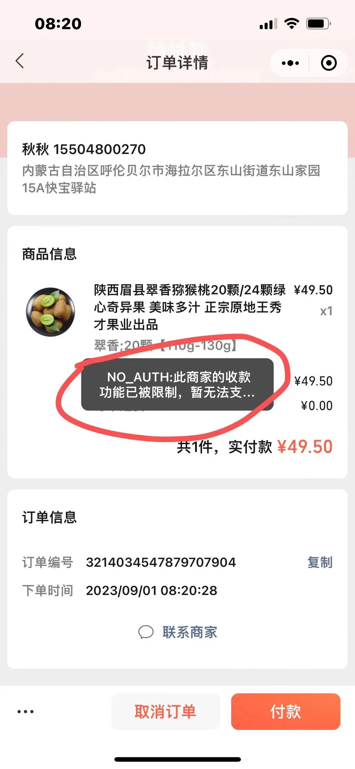 或者商户平台Pay.weixin.qq.com>账户中心>违约记录”或“商家助手小程序>风险处理”了解原因。