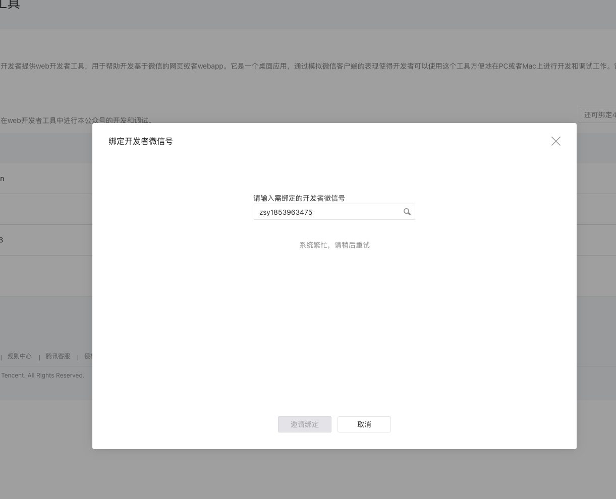 该问题已经持续 2 天,我在 开发者工具-web开发者工具-绑定开发者微信 按钮进行添加, 第一次可以成功搜索(因为没有及时关注公众号安全助手导致没添加上),第二次就必先 “系统繁忙,请稍后重试” 此后几十分钟内就无法在进行操作了。到现在已经两天操作不了了。。管理员账号有试过取消关注“公众号安全助手”再关注,但也没啥用,无济于事。