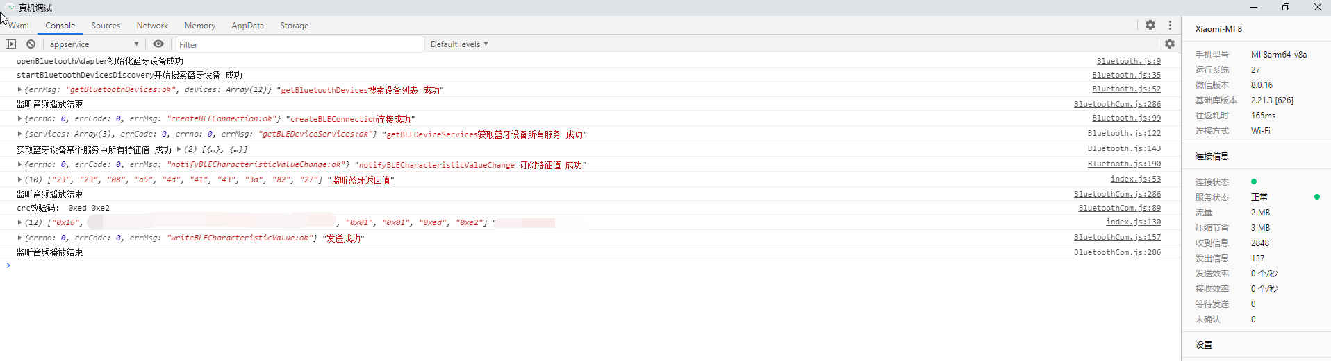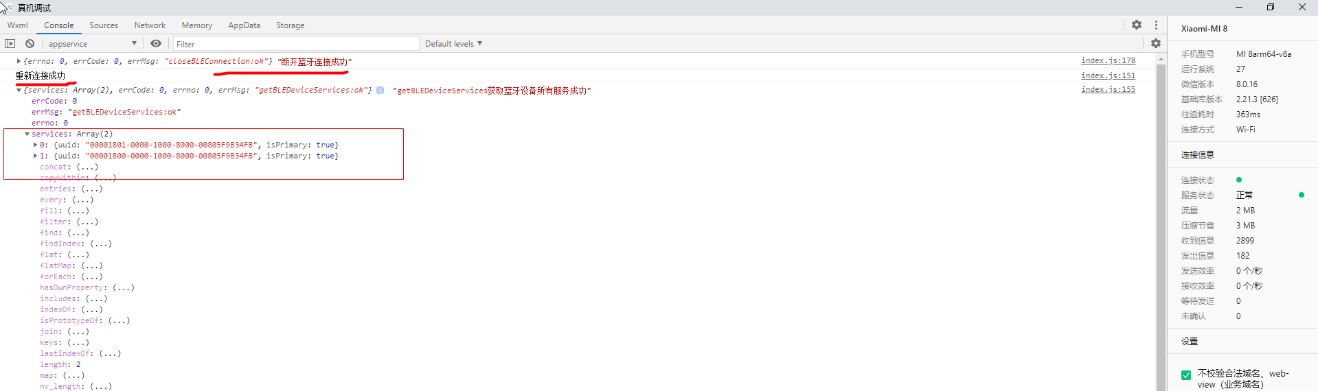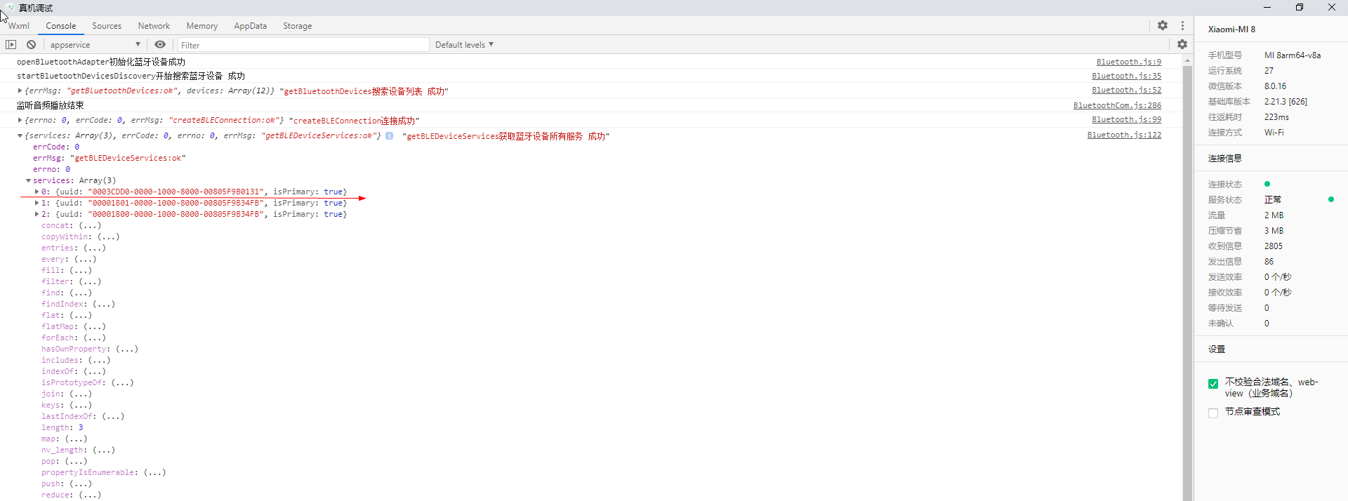 然后,我修改了重新连接步骤=>startBluetoothDevicesDiscovery=>wx.createBLEConnection=>wx.getBLEDeviceServices获取的uuid有主服务,可以和蓝牙正常通信