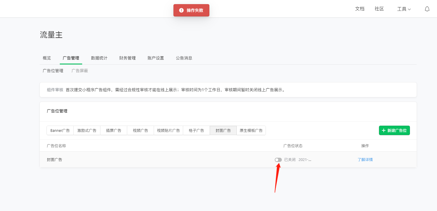 我首先开启封面广告,然后关闭封面广告,再开启时提示“操作失败”