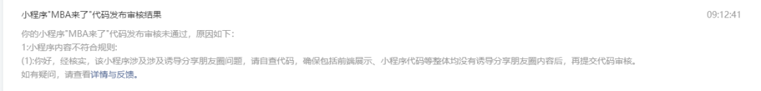 连续拒审2次,第一次提示涉及诱导分享朋友圈问题, 然后把项目里所有的朋友圈删除(只有2处还有一处是注释).然后提审,还是提示设计分享朋友圈,如下