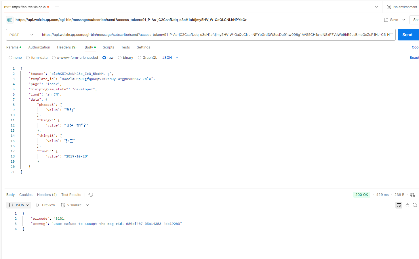 请求路径:https://api.weixin.qq.com/cgi-bin/message/subscribe/send?access_token=已隐藏