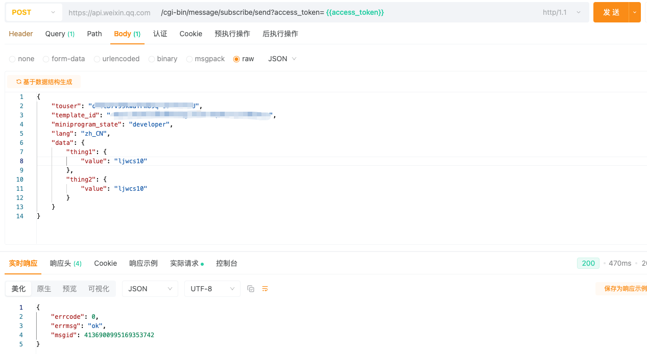 https://developers.weixin.qq.com/miniprogram/dev/OpenApiDoc/mp-message-management/subscribe-message/sendMessage.htmlhttps://developers.weixin.qq.com/miniprogram/dev/OpenApiDoc/mp-message-management/subscribe-message/sendMessage.html点击模板卡片后的跳转页面,仅限本小程序内的页面。支持带参数,(示例index?foo=bar)。该字段不填则模板无跳转