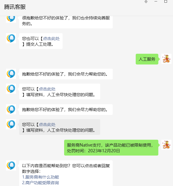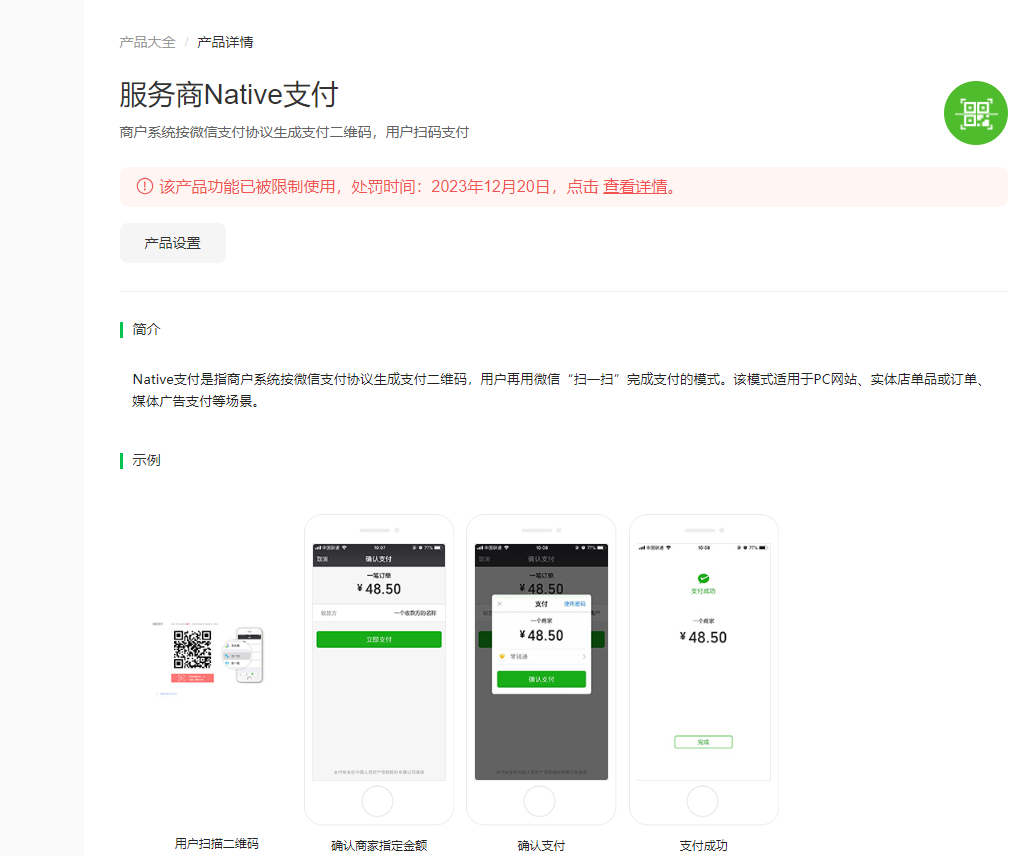 服务商Native支付,该产品功能已被限制使用,处罚时间:2023年12月20日