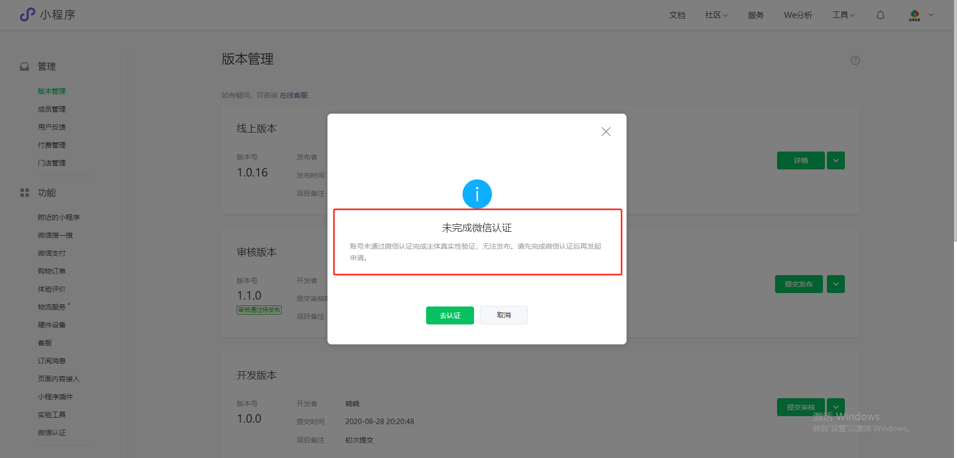 开发N年小程序,今天才发现不认证不能发布上架。。。