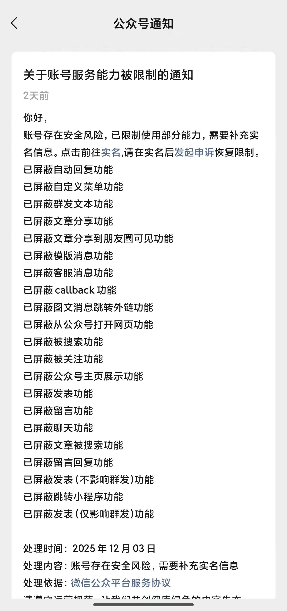 在2025年12月3号,得到消息说该公众号存在风险问题,现在已经实名,不知道如何解除封号,进行正常使用,该账号没有做任何违规事情,该账号的作用只是为了起到宣传作用,请尽快处理,拜托了