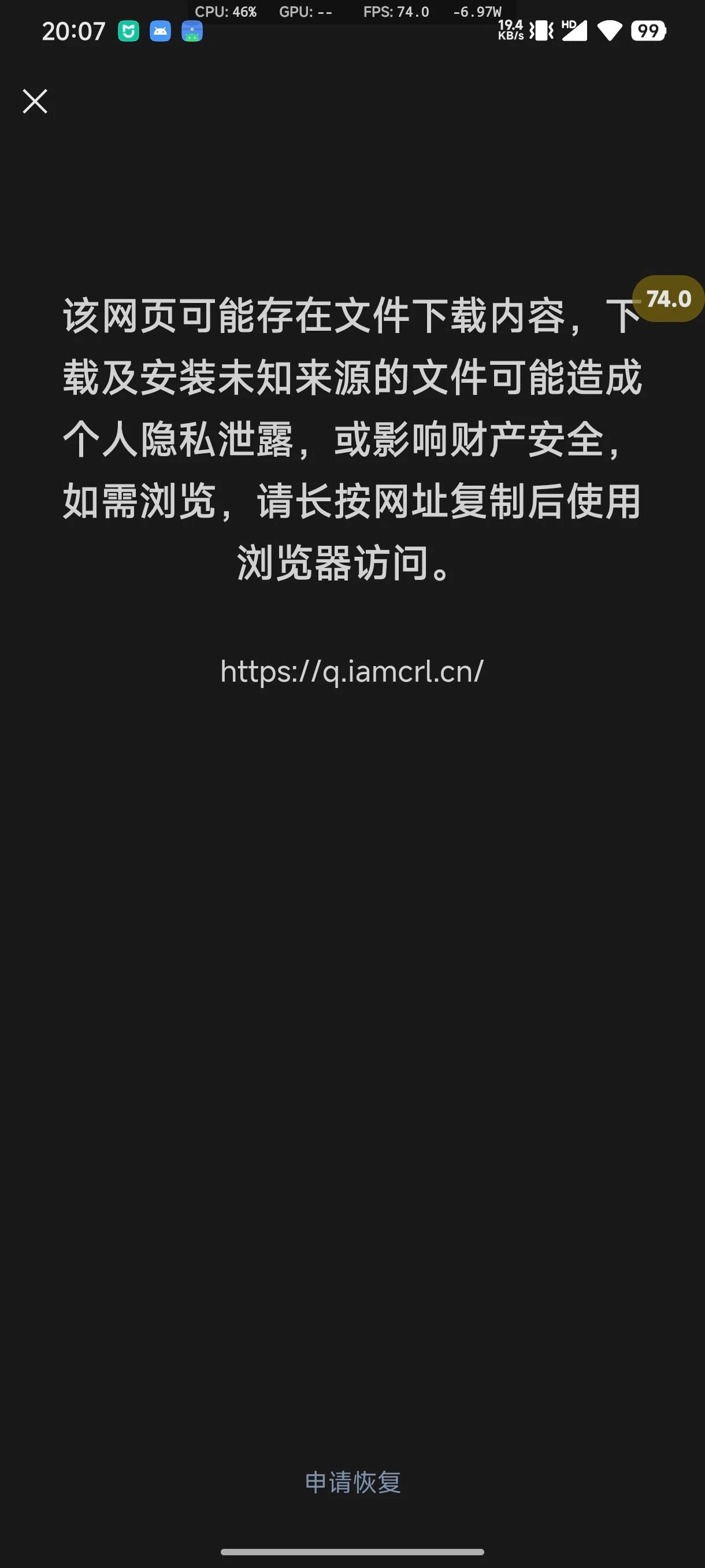 链接https://q.iamcrl.cn/出现提示:该网页可能存在文件下载内容,下载及安装未知来源的文件可能造成个人隐私泄露,或影响财产安全,如需浏览,请长按网址复制后使用浏览器访问。该网站为校园墙网站。