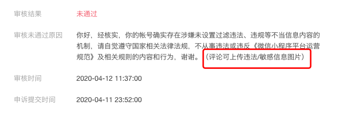在被封禁功能后我们自查了一遍所有的功能,有一个使用频率很低的功能没有做好内容过滤,然后做上去了。但是却没有申诉通过,反馈给我们的是评论可上传违法信息?我们的评论是接入了微信的内容过滤接口的了,图片是经过七牛云智能过滤的了,同时我们还有人工复查,但是图片的过滤是异步进行的,不是同步进行的,这个是常用的技术处理方案,也就是违法图片在上传时可以,但是一分钟内,如果被监测违法就会显示不出来。