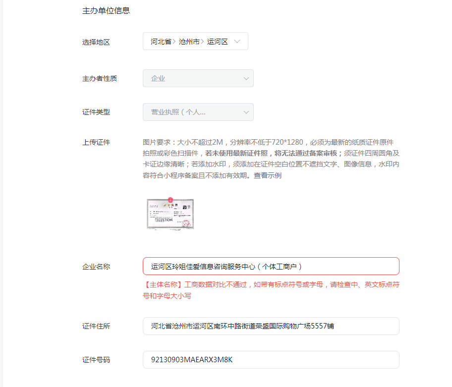 小程序在备案时,总提示平台检测到你的开办单位名称中含有半角“0”营业证照中一般使用全角“()”请确认是否需要修改?为什么插入问题图片不可以呢?小程序在备案时,总提示平台检测到你的开办单位名称中含有半角“0”营业证照中一般使用全角