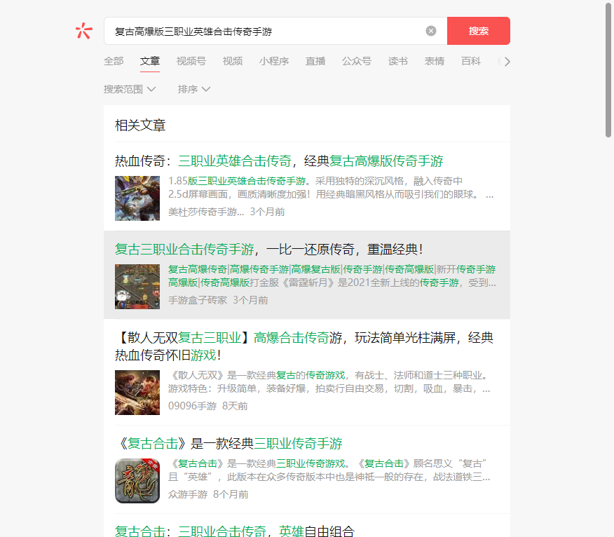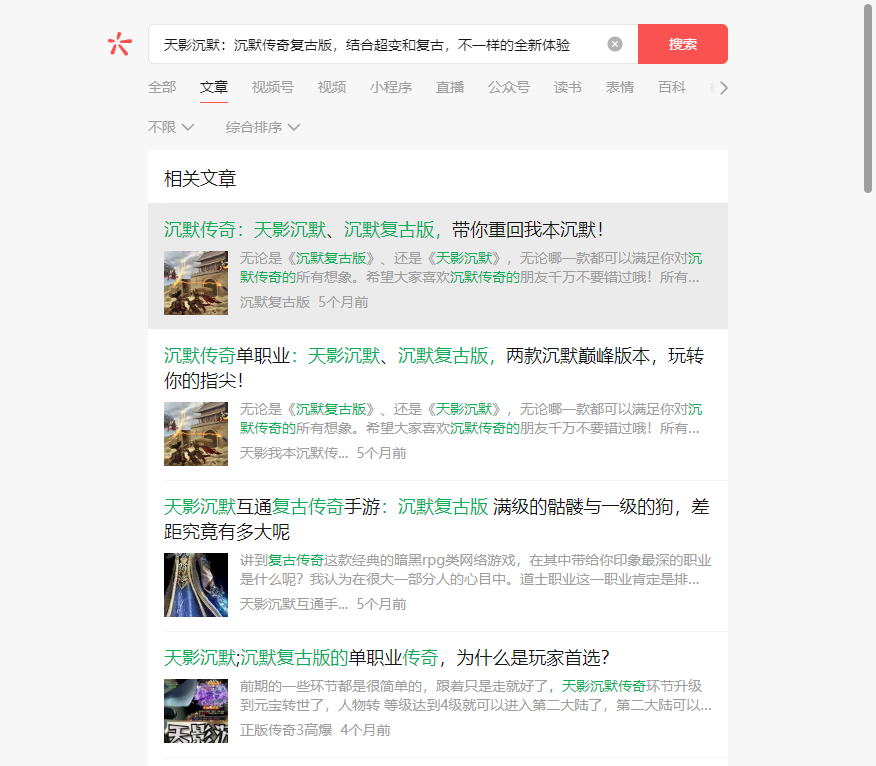 例如这篇文章:1. https://mp.weixin.qq.com/s?__biz=Mzg5OTU4NTEzNA==&mid=2247483753&idx=1&sn=8507c4a08237c7693e98216053537a78&chksm=c0504468f727cd7e653269a8ef954d0efcff86aae4fc55970f8cb144f8fa76d3efd3f630dc6b&token=58245050&lang=zh_CN#rd 2. https://mp.weixin.qq.com/s?__biz=Mzg5ODYwNDQ1MQ==&mid=2247483655&idx=1&sn=296347b02b8bfe8b16a244f8f4ecada3&chksm=c0614dcbf716c4dd3aa52c39297dfda25f317b2e5a300d46f4f5efbf37b85b240ad0a9f6a952&token=2053119580&lang=zh_CN#rd文章标题:1. 复古高爆版三职业英雄合击传奇手游 2. 天影沉默:沉默传奇复古版,结合超变和复古,不一样的全新体验