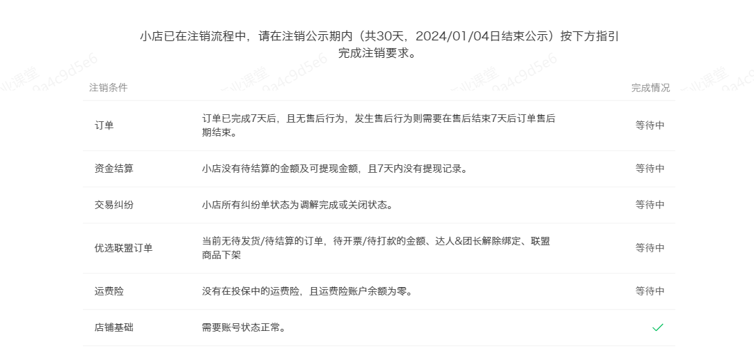 因为资质原因,没开通上架商品,想注销了用其他营业执照开小店,但这个注销显示这几个在等待中,但是我又没上架商品,这几个也不存在,要怎么才做,有没有大佬指导下