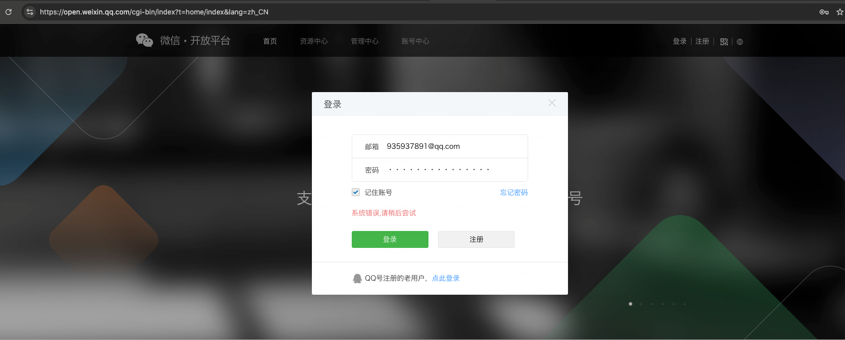 1、帐号为qq邮箱,输入时仅输入qq号码,系统会提示帐号或密码不正确并无法登录平台。