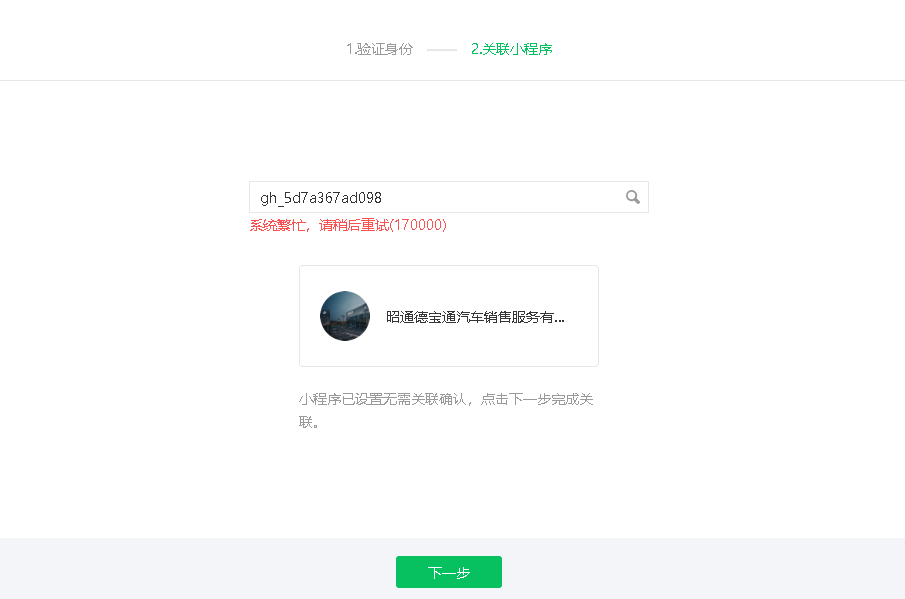 你好,170000是关联小程序时,小程序不存在管理员,需要绑定管理员后再试试。