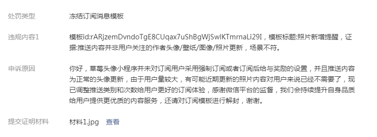 2、处理情况:已冻结其违规订阅消息ID并下发站内信警告;