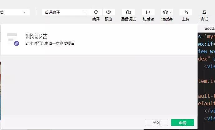右下角通知测试报告申请成功,点击详情没有反应,在界面的测试下面也没有任何提示。