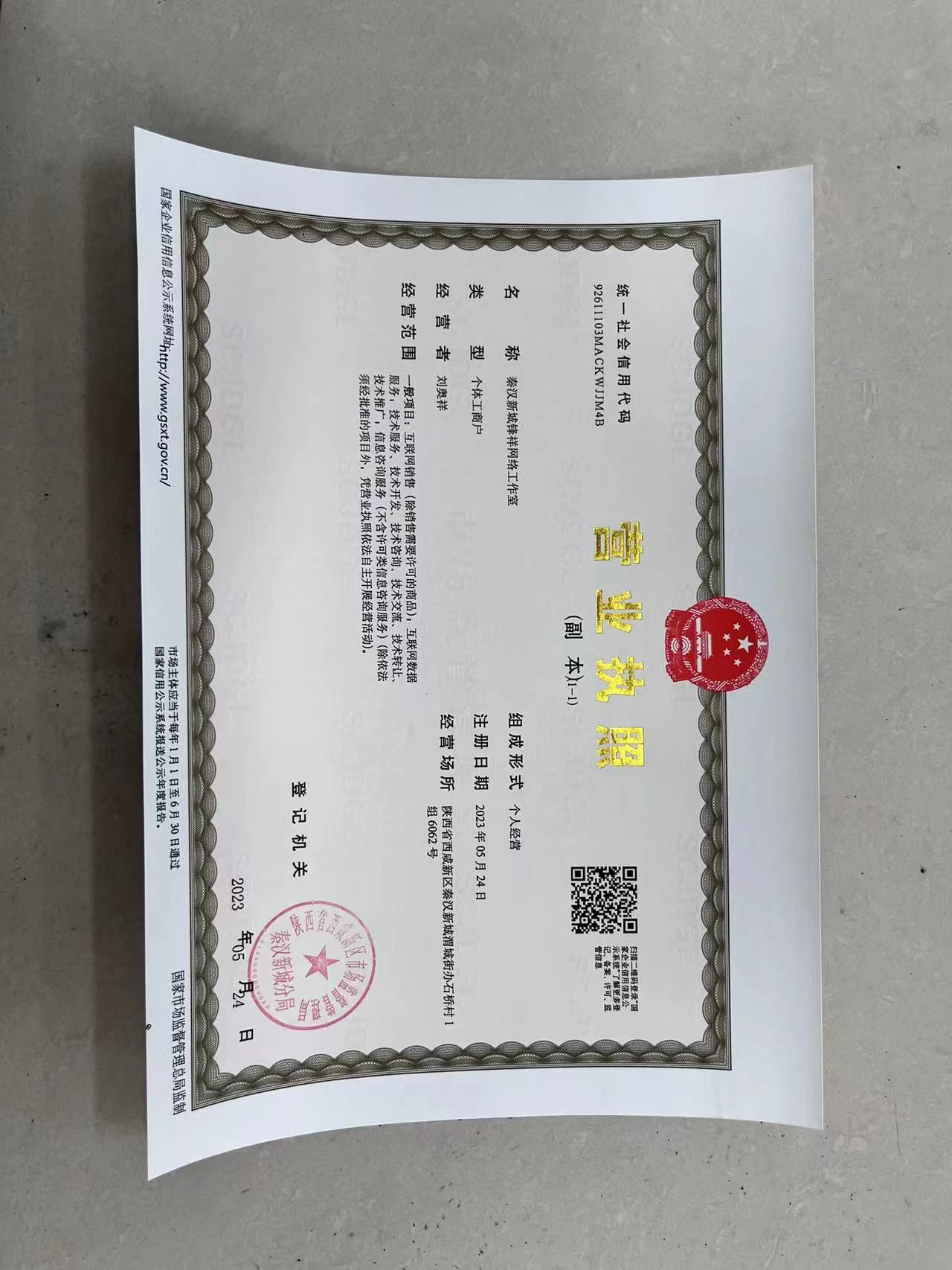 营业执照全称:秦汉新城锋祥网络工作室