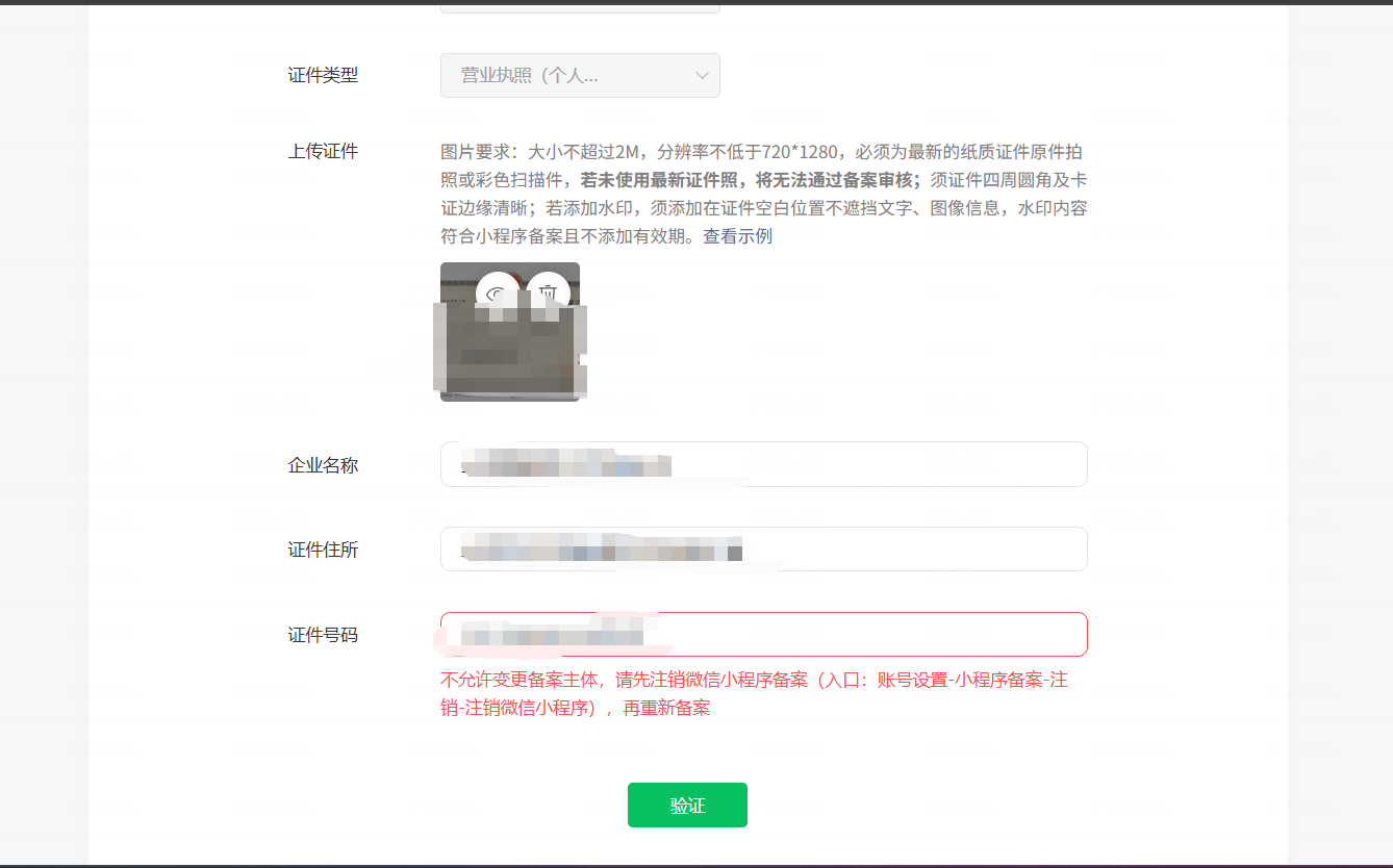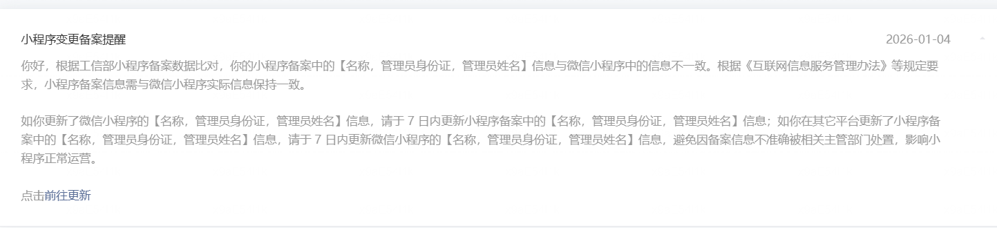 我需要变更小程序管理员信息,已收到消息(图1),点击前往更新后第一步需要填写主体信息,使用原主体信息提示不允许变更主体(图2),现在应该怎么变更小程序管理员信息?